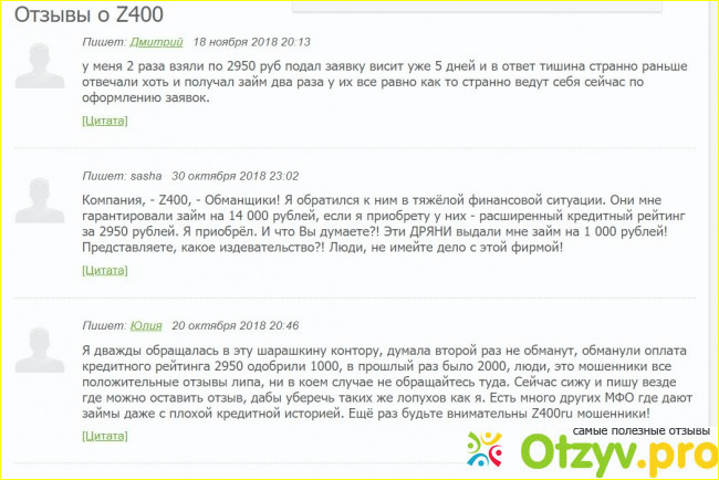 Z400 ru – очередной проект, направленный на обман собственных клиентов. Z400 ru тесно связан с онлайн-займами, и проблемы пойдут на стадии подписания договора и получения денег на руки. Золото правило гласит: «Никогда не связывайся с мошенниками из контор микрозаймов – они тебя обманут».