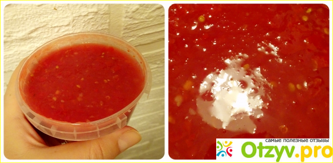 Благодаря широкому горлышку достать аджику из контейнера можно любой ложкой, естественно чистой. Так как она достаточно жидкая, необходимо иметь в виду, что приправа сильно растекается по поверхности посуды или хлеба. Приправа идеально подойдет, как к первым, так и вторым блюдам. Кто – то очень любит добавлять её к мясным и рыбным продуктам, но лично я просто обожаю кушать эту острую приправу с постными, немеющими своего ярко выраженного вкуса продуктами. В данном товаре меня устроило абсолютно всё, кроме отсутствия информации о том, как долго можно хранить приправу в холодильнике после вскрытия продукта.
