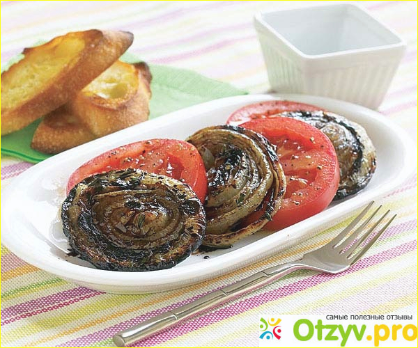 Лук нарезать кольцами и обжарить до готовности, но лучше запечь. Посолить морской солью. На тарелку положить кольцо лука, сверху него томат нарезанный кольцами и посолить его и поперчить. Подавать с гренками с белого хлеба. Это может быть самостоятельное блюдо. Так и закуска или дополнение к мясу. Второй вариант лук перед приготовлением обмазать мёдом.