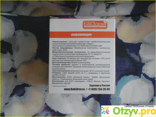 В коробке находятся стики с закваской. Хранить их нужно в холодильнике, можно и в морозильной камере, на свойства это не влияет.