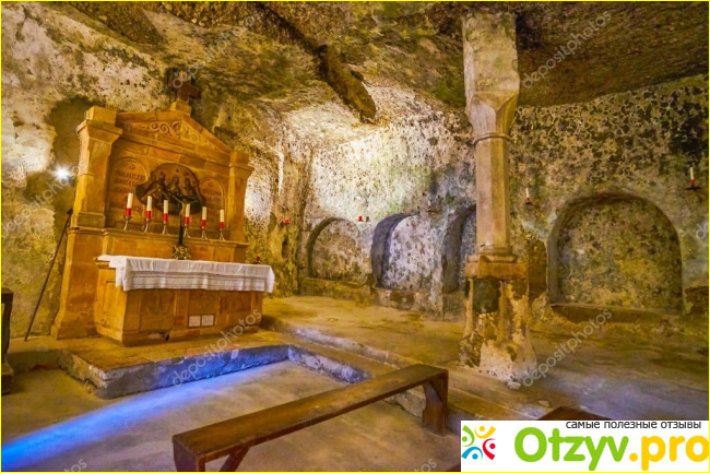 На территории катакомбов, есть лестница, которая и приводит нас к часовне Святой Гертруды, ее освятили в 12 веке, но и сейчас здесь ежедневно проводят мессы(это так называемая служба). Часовня была вырублена в скале, но жившие в ней отшельники, постепенно расширили и то, что у них получилось, мы и можем наблюдать.