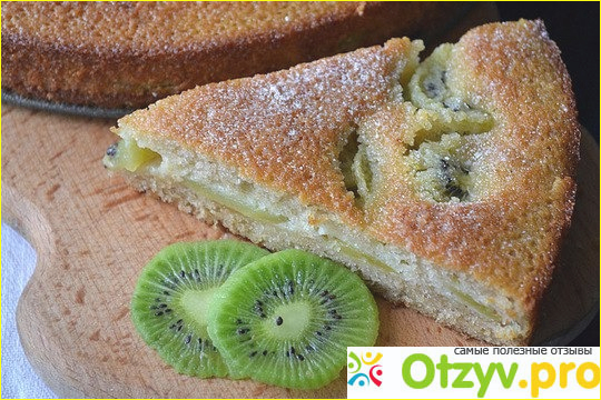Всё тесто отправляем в форму и вылаживаем дольки киви сверху, заранее очищенные и нарезанные.