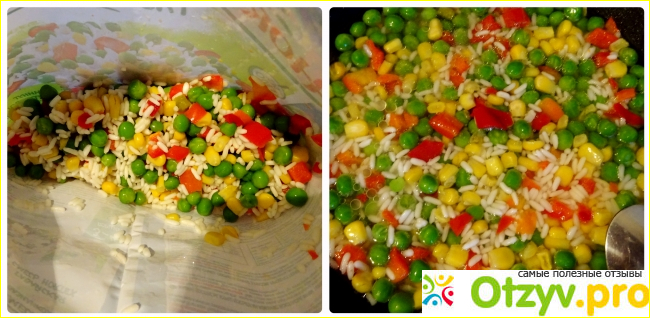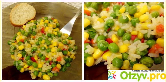 Полученный результат меня порадовал, его вы можете наблюдать на фотографиях. Рис не разварился. Блюдо получилось красивым, вкусным и очень сытным. Однако у людей, имеющих проблемы с ЖКТ, может появиться дискомфорт, так как в состав смеси (кроме риса и болгарского перца) входят горошек и кукуруза.