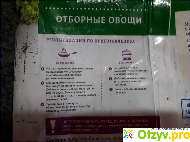 Есть рекомендации по приготовлению. Здесь предлагают добавить мед и лимонный сок. Еще не пробовала, надо испытать. Важно, что овощи не надо размораживать, а готовить сразу. Не нужно чистить, резать, покупать по отдельности. А просто открыть, обжарить в течение 15 минут и гарнир готов. Как вкусно с мясом! Прекрасно добавить отварной рис. Я всегда храню такие наборы в морозильнике, чтобы быстро приготовить, когда, например, пришли гости. Да вообще это удобно и просто.