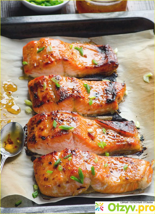 Во избежание пригорания блюда форму для запекания устилаем фольгой и обильно смазываем соево-медовом маринаде, в котором находятся кусочки лосося. Шкуркой вниз выкладываем филе в форму. Если у вас есть кунжут или семена льна, то можно посыпать сверху. И заключительный момент - отправляем всю эту красоту в ранее разогретую до 220 градусов духовку. Выпекаем 20-25 минут при температуре 220 градусов. Запеченный лосось в духовке – готов! Подавайте!