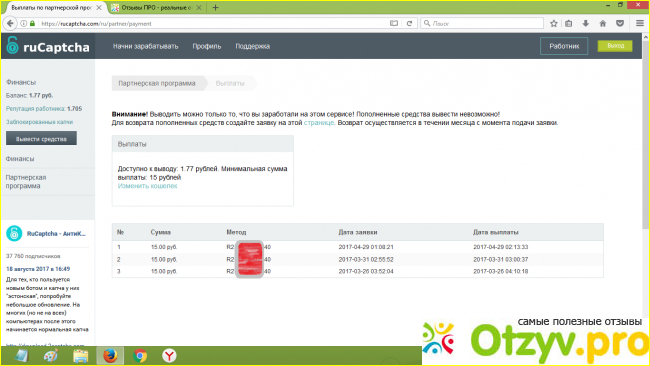 В итоге, мне удалось вывести из системы 45 рублей. Выводила я три раза по 15 рублей, так как это минимальный порог к выводу. Деньги зачислялись на мой кошелек Вебмани. Приходили спустя 3-4 часа. Потом как-то бросила я всю эту затею. В последнее время стала опять наведываться. Может у меня руки крюки стали, но уже с натяжкой набираю по девяносто копеек или по рублю. Приходит капча. Вроде я ее правильно решаю, нажимаю отправить, а она вновь приходит ко мне. Умный человек понимает, что она неправильная и нужно ее исправить, я щуря глаза и тратя по несколько секунд опять на ней зацикливаюсь. При этом копейки ко мне не поступают. Пробовала скачивать их программу, чтобы решать без задействования браузера, но она мне не понравилась, хотя никаких лагов и багов я там не встречала. Поэтому капчи решаю на сайте.