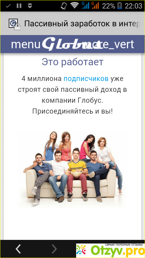 Впринципе неплохой сервис, регистрируемся, скачиваем приложение, на телефон приходит реклама нужно нажимать только на крестик чтобы выйти. Можно посылке своей находить рефералов, строить свою команду. Но, я стал куда то с некими проблемами. На сайте я нахожусь давно. Поначалу приходила реклама и все было хорошо но потом, незнаю уж совпадение или нет, появился реферал и реклама совсем перестала поступать. Удалила приложение и забыла о нем. Через долгое время я сново его загрузила, и то же самое, первые несколько дней все отлично ну а потом та же схема. И так несколько раз я то удаляла, то загружала приложение от Глобус Интерком. Мои несколько рефералов довольны и работают. Ну а меня вот так вот. И самое главное что невозможно со службой поддержки связаться. Для отправления им вопроса на почту для подтверждения должно придти письмо, но оно не приходит.