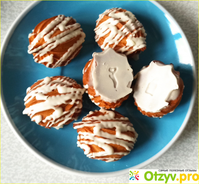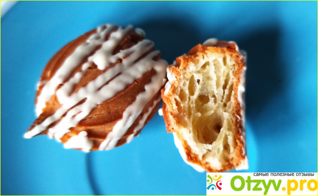 Заварные пышечки ровненькие, все целенькие, покрыты белой глазурью снизу полностью, а сверху причудливыми полосами. Выглядят ну очень соблазнительно.