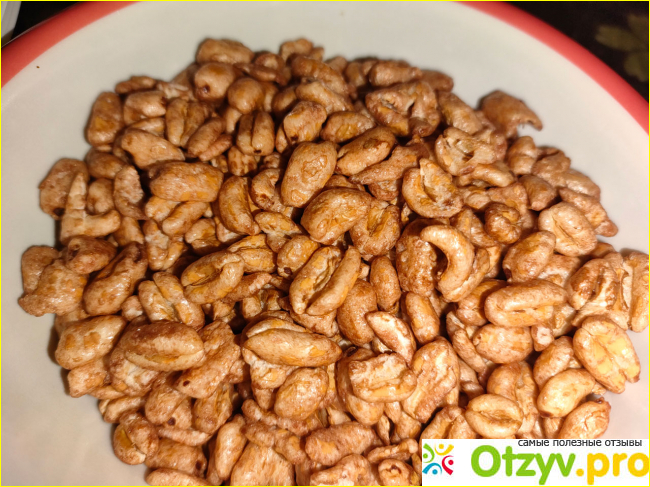 Отдалённо напоминает поп-корн или воздушные рисовые брикеты раньше. По калорийности 400кк, что не так уж мало, но ожидаемо. Вкусный продукт. Наверное с молоком будет хорошо.
