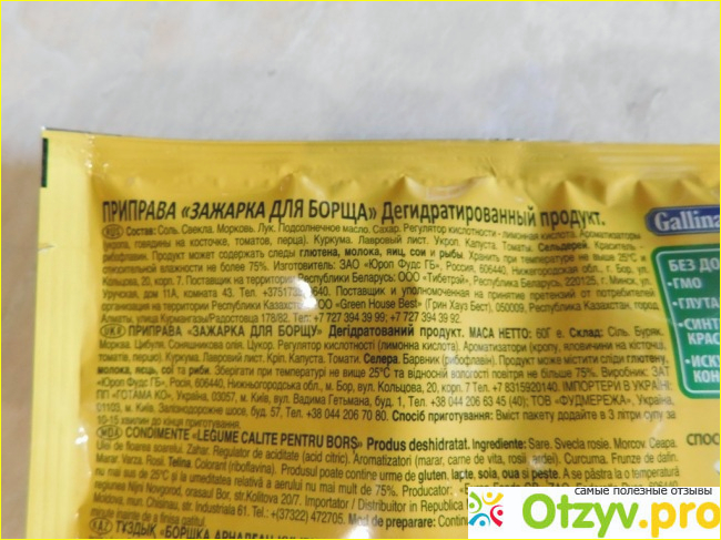 Зажарка для борща не содержит ГМО, глутамата натрия, синтетических красителей и искусственных консервантов.