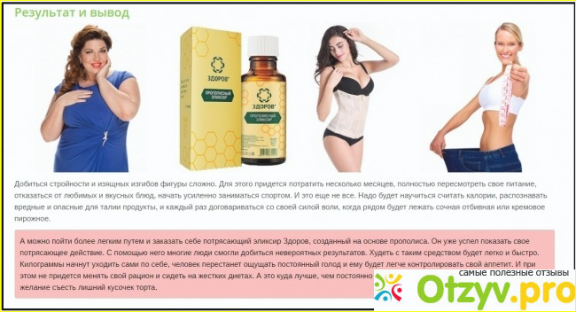Эликсир стройности "Здоров" производитель позиционирует как отличное средство для похудения. На сайте вы можете ознакомиться со всеми преимуществами, составом и отзывами по этому препарату, хотя лучше об этом читать на на этом сайте, а на сторонних ресурсах. Мы лишь вкратце поясним, как Здоров рекламируют на сайте.