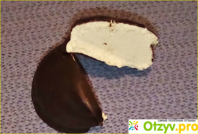 Внутри белый, нежный, мягкий, ароматный. Глазурь тонкая. Зефир неплохой, но для меня все же лишком сладкий. Сама покупать не буду. Просто я люблю более интересные сладости. А другим могу рекомендовать.
