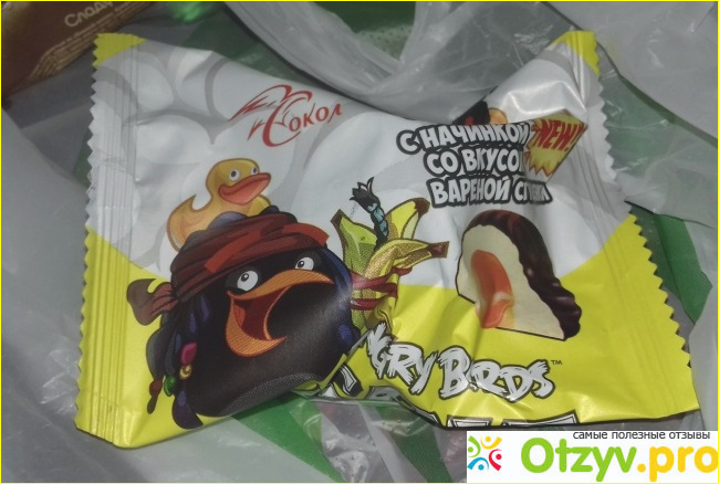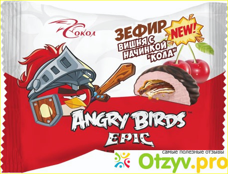 У зефирок с начинкой "кола" обертка красно-белая, на ней изображена красная птичка из "Ангри Бердс", я просто не знаю как они называются эти птички. А на обертке с зефиром со сгущенкой изображен черная птичка. Данный дизайн очень яркий и забавный, детям такое точно нравится, у меня сын был в восторге поначалу от конфет, но вкус правда не заценил.