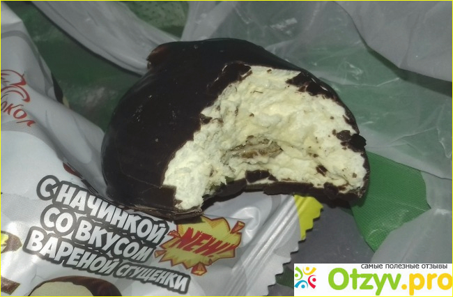 По внешнему виду данные конфеты имеют обычный вид, ну точнее для зефира обычный вид. Они круглые, в виде небольшого купола сделаны по форме и политы шоколадной глазурью. А вот внутри зефирки разные - вишнево-коловая конфета внутри имеет розовый цвет у зефира и темный у начинки, а банановая со сгущенкой имеет желтый цвет у зефира и темно-коричневый у начинки.