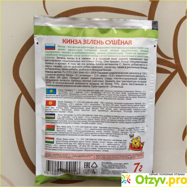На пакетике производитель оставил информацию о составе, в который конечно же входит только кинза, также можно ознакомиться с её названиями в различных странах, ведь эта замечательная приправа известна не только в разных странах, но и на нескольких континентах. Её активно использую для приготовления национальных блюд, но даже если вы не готовите никакие национальные блюда кинзу можно добавлять в привычные супы и салаты, делая их вкус запоминающимся.