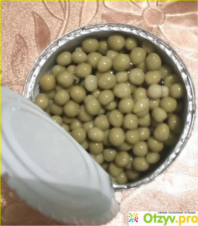 Сам горошек в банке чистый и, что удивило, почти весь ровный, это редко бывает. Он красивый прямо, не поломанный. Шелуха есть, но ее мало. Воды тоже немного.