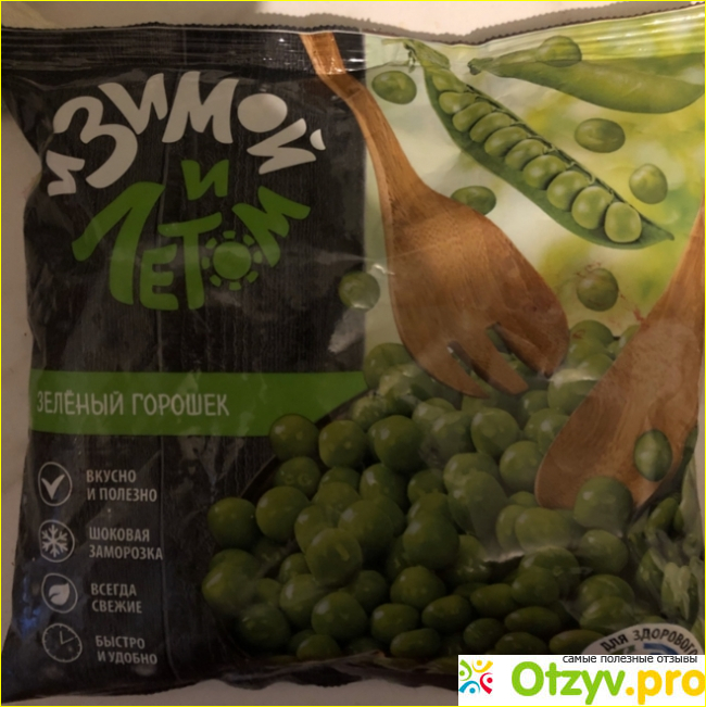 Но дизайн упаковки мне понравился. Выглядит она стильно, надписи емкие и лаконичные. На передней части четко выделены преимущества горошка. Я отметила для себя среди них свежесть и шоковую заморозку. Это очень хорошо, потому что при такой обработке овощи действительно остаются свежими.
