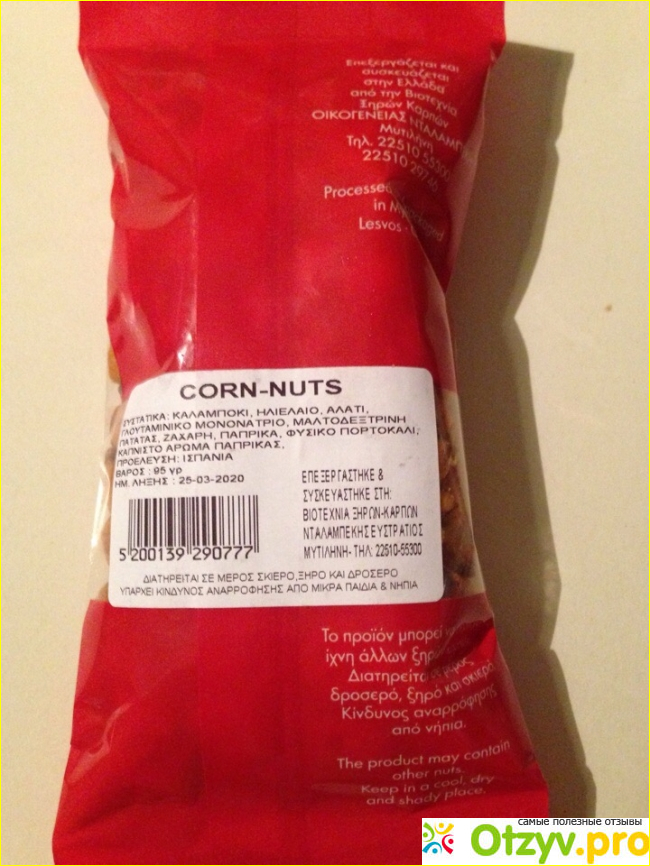Сами зерна, думаю жаренные. Я купила небольшой пакетик и не могла оторваться пока не прикончила продукт полностью. Подумав несколько минут, пошла в магазин за добавкой, благо он близко расположен. Кукуруза приготовлена с добавкой копченого вкусового ароматизатора, перца чили, соли и сахара. На вкус очень хрупкая и вкусная, невозможно оторваться.