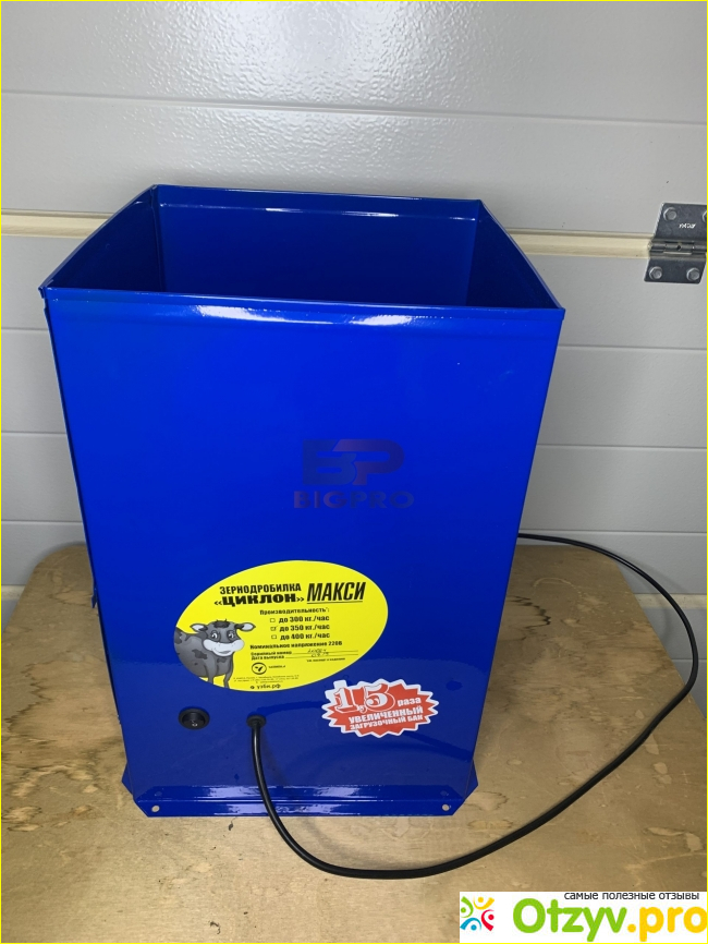 Для примера взяла зернодробилку от нашего отечественного производителя я ярким и могучим наименованием Циклон 350. Цифры, кстати, указывают на его производительность, то есть 350 килограммов зерна в час прибор может обрабатывать без проблем. Но об этих параметрам я расскажу чуть позже, сейчас узнаем принципы работы агрегата, его свойства и технические стороны. Далее расскажу обо всех его достоинствах и даже имеющихся недостатках.