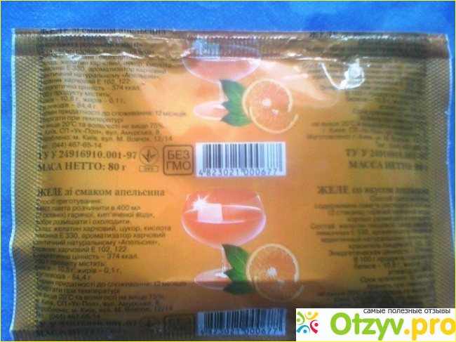 Во первых данный товар, со странным хим запахом, совершенно не аппетитно пахнет. В средине упаковки кристаллическая крупа. На упаковке указан состав и способ приготовления желе.