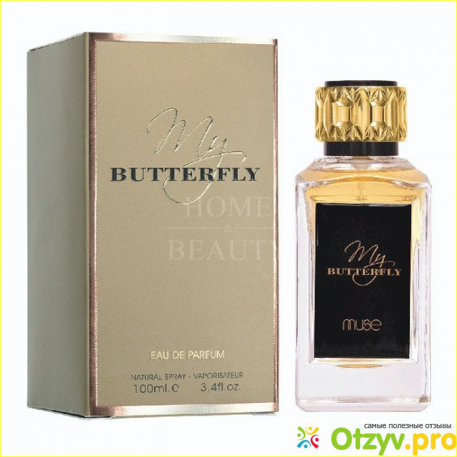 На главной упаковке духов идет надпись духов на черном фоне золотыми буквами My Butterfly lamuse.