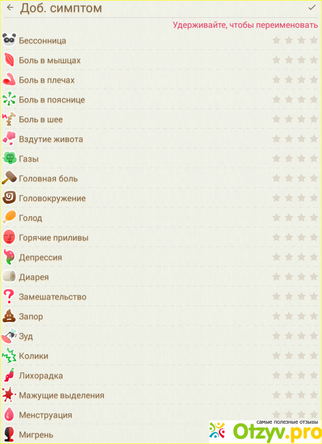 Также есть возможность указать настроение, прием лекарства, дать оценку проявленным симптомам и указать результата теста на овуляцию.