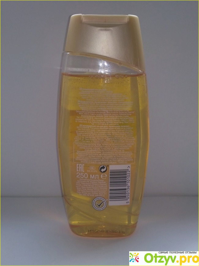 На обратной стороне на приклеенной этикетке указан способ применения. Срок годности 3 года с даты производства, указанной на упаковке. Дату пишут внизу бутылки на донышке. Объем этого средства для купания составляет 250 миллилитров. Гель Российского производства. Конечно же есть состав продукции на этикетке. Вся информация указана на трех языках.