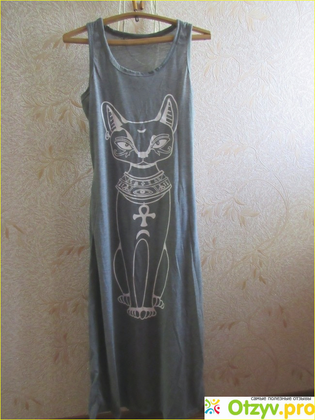 Итак, платье от фирмы Boho, производство - Китай. Но, довольно таки хорошее. Серого цвета с рисунком большого белого кота, что-то на египетскую тематику. Хоть и простенькое, но смотрится довольно мило и симпатично.