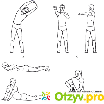 Первое упражнение - поставить ноги на ширину таза, поднять руки над головой, взяв пальцы " в замок". Корпус, таз и конечности не трогать, совершать вытягивающие движения в области живота и двенадцатиперстной кишки. Вытягиваясь поочередно в разные стороны.