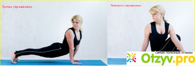 Второе упражнение - стопы на ширине таза, руки вытягиваем вперед. Поочередно в разные стороны заводим руки за спину, стараясь как бы перекручивать область живота.