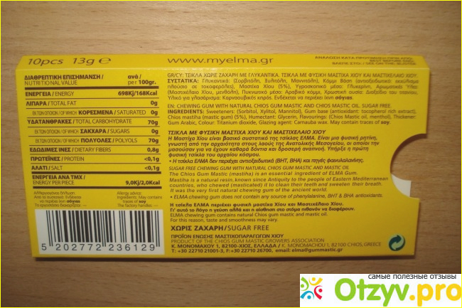 ELMA выпускает огромный ассортимент жевательных резинок. Данный вид не имеет сильно выраженного вкуса и запаха. Запах у мастихи очень деликатный. Если жевать жевательную резинку с мастихой, то свежесть дыхания достигается не за счет огромного количества мятного экстракта, а за счет того, что убиваются все болезнетворные бактерии во рту.