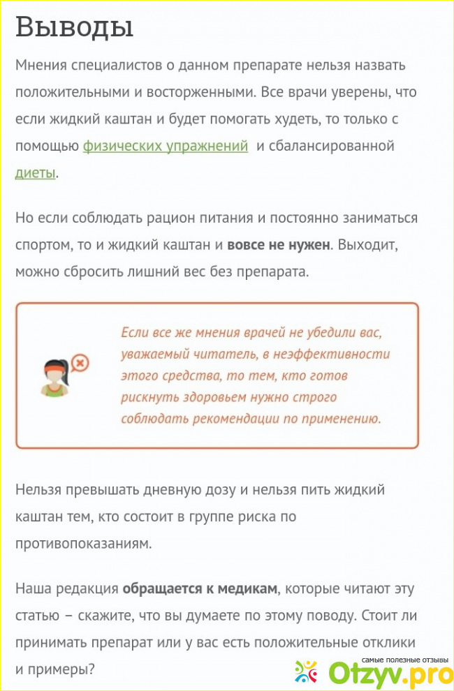 Конечно, все сейчас хотят быть стройными. И многим хочется не просто сбросить вес, сделать это в кратчайшие сроки, однако это не гарантирет безвредность нашему организму. И поэтому в нынешнее время вы отыщете огромное множество вариантов. Самый лучший и не то, чтобы безвредный, а полезный - это правильное питание. Есть вариант - ещё и спортом заняться. А можно просто купить чудо-средство, в эффективность которого так хочется верить наивным потребителям. Знаете, что скажу: это средство является чем-то вроде слабительного (оно хорошо очищало организм), но знакомая также говорила, что оно снижает аппетит. (Кстати, о вреде похудения с помощью слабительных средств уже было мною рассказано). И это правда, она стала есть меньше, когда его принимала, но так и не похудела лишь потому что стала употреблять его не каждый день, т. е. был сбит график. Все же я не отрицаю, что эффект был, особенно в первое время. Но не стоит думать, что жидкий каштан будет вашим вечным спасителем, ибо имеет побочные эффекты, а также вызывает психологическую зависимость и привыкание.