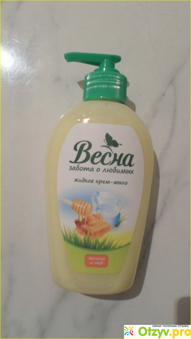 Я просто обожаю сильной и большой струёй воды из под крана взбить распенить жидкое мыло до пушистой, и воздушной пены. Жидкое крем - мыло "Весна" - это концентрированная мыльная жидкость и немного густоватая - молочного цвета. Крем - мыло действительно заботится о любимых с удивительным составом молочно медовым раствором. Мне очень часто приходится мыть свои руки смывая грязь и микробы, а большая и мощная струя отлично смоет с пеной все нечистоты. Жидкое крем - мыло приятно пахнет терпким цветочным ароматом. Мне понравилось это жидкое крем - мыло приятно заботящееся о моей семье и у меня в доме постоянно стоит флакончик с этим косметическим средством.
