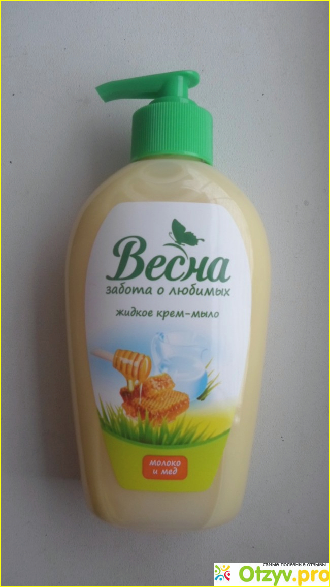 Жидкое крем - мыло "Весна" - это густоватая консистенция жидкого мыла интересного бежевого и какого то нейтрального цвета. Приятный и нежный крем питает кожу подпитывая витаминами и микроэлементами на глубоком межклеточном уровне. Это высокоэффективное моющее и увлажняющее мыльное косметическое, парфюмерное средство. Крем - мыло с содержанием молока и мёда отлично питает кожу и увлажняет делая её мягкой и шелковистой. Замечательное мыло очищает мою кожу и защищает от микробов и бактерий. Очень приятно, что это жидкое мыло не вызывает аллергических реакций и раздражений на коже. После этого густого моющего средства не остаётся липких пятен на коже и ощущается кристальная чистота и свежесть чистых рук. Приятное увлажняющее мыло смывает все запахи и я считаю это отличным гигиеническим подспорьем. Но меня привлекла цена этого парфюмерно - косметического моющего средства. Очень мне не хочется мыть руки другими сортами мыла, а цены что то начали кусаться и это жидкое крем - мыло как раз, и устроило меня не дорогой ценой.
