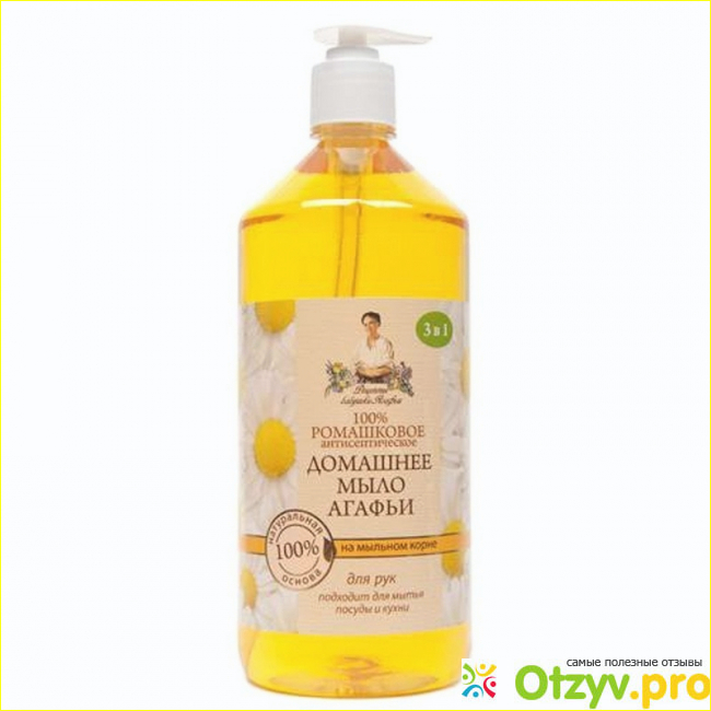 Уже давно хотела попробовать жидкое мыло из данной линии. Правда глаза разбегались-какой вид взять. Остановила свой выбор на средстве в котором этикетка обещала: "Домашнее мыло Агафьи 100% ромашковое антисептическое средство.