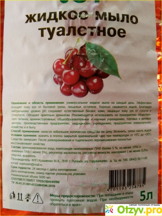 Когда он подошел к концу, я купила пяти литровку жидкого мыла с ароматом вишни за 150 рублей и средства для мытья посуды за 165 рублей "сочный мандарин".