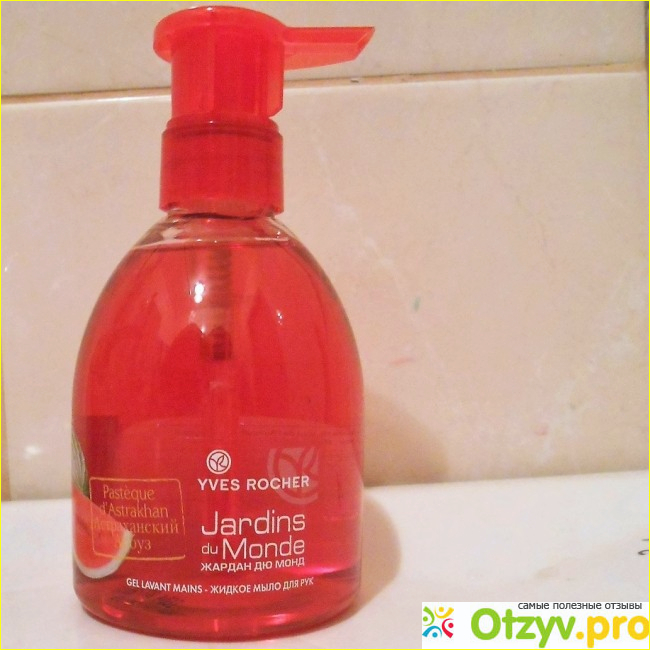 Мне нравится арбузный аромат, и в этом жидком мыле он очень даже хорошо чувствуется. Такой вкусный запах распространяется на всю ванную комнату! Руки после мытья этим мылом становятся очень мягкими, наверное, еще и потому, что в составе этого средства есть также алоэ вера. Так что это жидкое мыло, как и вся продукция фирмы Yves Rocher, создано на основе растительного сырья. Лично для меня это важно, потому что у меня очень чувствительная кожа рук.