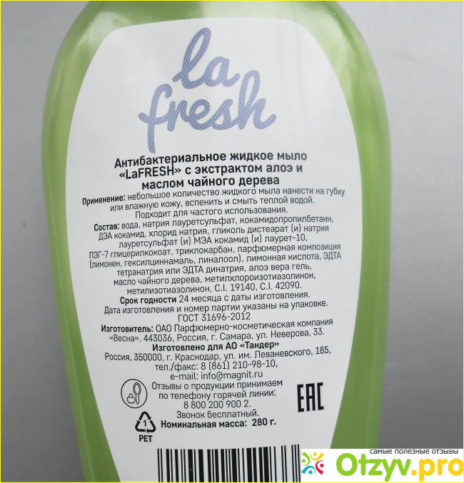 Именно из-за масла чайного дерева в составе жидкого мыла La fresh я и купила это средство гигиены. Кроме того, там еще и экстракт алоэ вера содержится, если судить по этикетке.