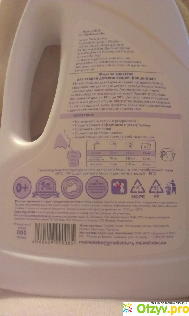 Знакомлю вас сегодня с германским средством для стирки в виде геля под названием " Meine Liebe". Жидкое средство предназначено для стирки детских вещей с самого рождения. Объём бутылочки 800 мл, немножко не хватает до привычного стандартного литра.