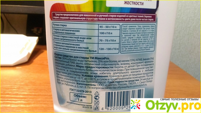 Оформление упаковки приличное, взгляд притягивает. Литровый объем за такую смешную цену. Это почти бесплатно. Да ещё и цвет тканей сохраняет даже после частых стирок, что обещано производителем надписью на упаковке. Жесткость воды не имеет значения, отстирывает в любой, так информирует производитель. Изготовитель из г. Санкт-Петербург. Средства бытовой химии, произведенные в крупных городах, у меня всегда вызывают доверие. Возникло желание приобрести на пробу.