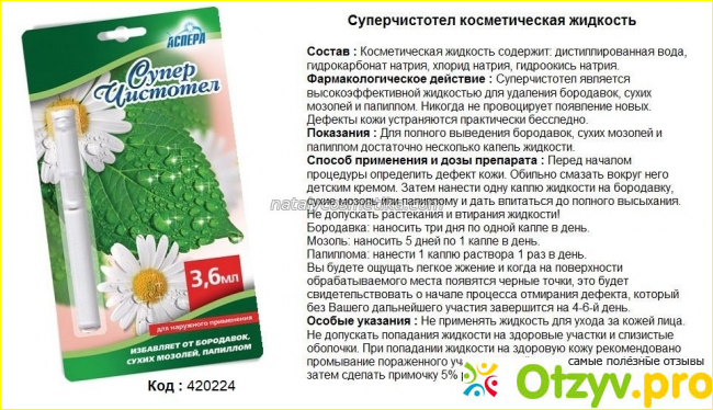 Жидкость Аспера Суперчистотел - очень сильно жгёт, действует как кислота. Всё покраснело вокруг маленькой папиломы на сантиметра 1,5. В итоге - жикость мы забросили, а папилома на том месте как была так и осталась. Только покраснение потом зудело и ныло.