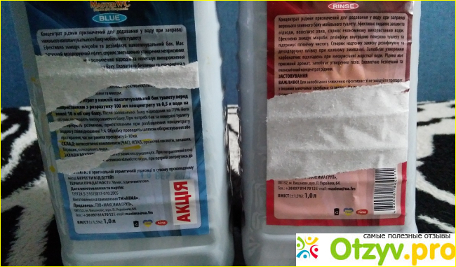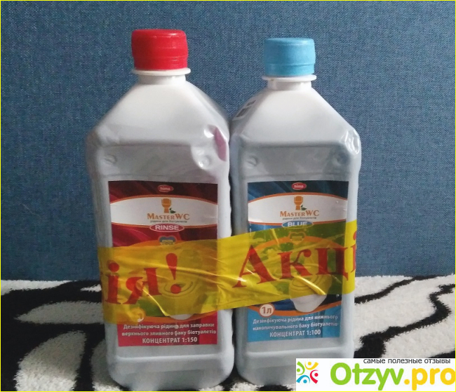 Указано что жидкость концентрированная. Но на вид она редкая, бывает гуще. Как обычно, для нижнего бака синего цвета, выполняет основную задачу по переработке отходов, попадающих в бак туалета. Розовая - для верхнего бака с водой для смыва, для ухода и дезодорации за верхней емкостью.