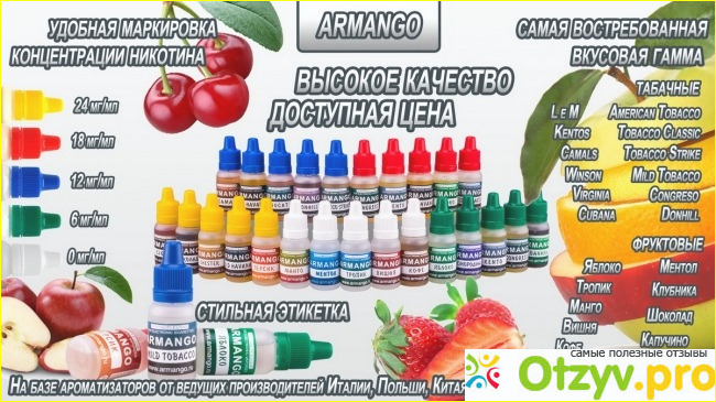 У бренда Armango - очень большое количество вкусов, что позволяет найти именно "свой" вкус даже самому вредному клиенту. Одному нужны терпкие, другому сладкие, а третьему вообще что-то необычное или даже экзотическое и фирма позаботилась о том, что каждый покупатель смог удовлетворить свои вкусовые пристрастия. Действительно, я еще не встречала не одного бренда, который выпускал бы такое количество различных жидкостей.