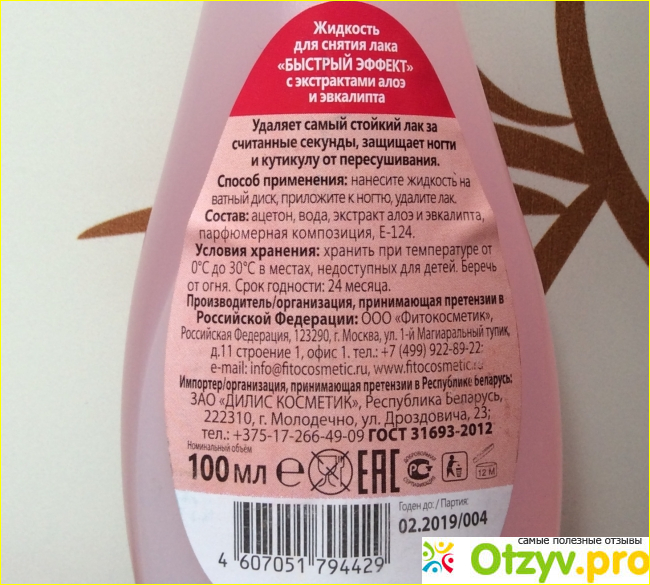 Меня умиляет обещание увлажнения. И это за счёт добавления экстракторов алоэ и эвкалипта. Какое может быть увлажнение после использования средства, где в составе есть ацетон, к тому же на первом месте? Средство немного подсушивает ногтевую пластину, но только поверхностно и сильно не вредит ногтям. Кутикуле оно не приносит никакого вреда. Увлажнения нет и не будет.