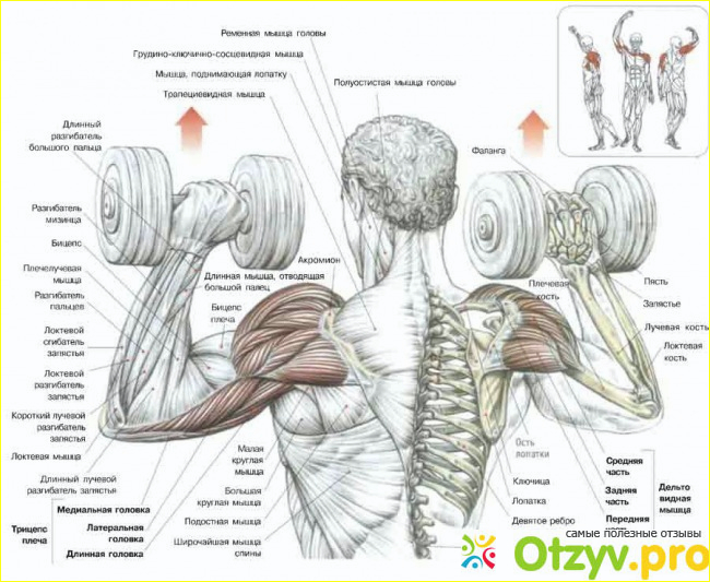 Все эти маленькие выводы я сделал на собственном опыте, поэтому могу смело сказать что это работает. Теперь перейду непосредственно к упражнению "жим гантелей сидя". Данное упражнение является отличным для проработки всех трех пучков дельтовидных мышц. Для начинающих атлетов именно это упражнение, на мой взгляд, может принести успех в создании красивых и широких плеч. Выходя из информации Дениса Борисова на видео: можно сделать вывод что данное упражнение способствует большей амплитуде движения (нежели со штангой) и соответственно мышцы в этом упражнении больше растягиваются. Лично я до операции делал жим со штангой, сейчас же я делаю жим стоя с гантелями, для меня так легче сконцентрироваться на работе плеч. Станьте перед зеркалом прямо и следите чтобы ваши плечи и тело не откидывались назад, это действительно очень важно. Опять таки, возьмите лучше меньший вес, но зато будьте уверены в правильности техники. В этом упражнении не нужно задействовать весь корпус, выкидывая гантели вверх, зафиксировав корпус прямо вы строго поднимаете и опускаете гантели по одной и той же амплитуде. Маленький совет: хорошим вариантом выполнения будет задерживание гантелей в верхней и нижней точке. Это способствует правильному и техничному движению, таким образом у вас не будет присутствовать раскачка и делать "читинг" у вас не получиться.