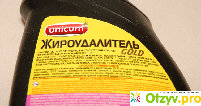 Самое главное, что им очень удобно пользоваться. Как вы заметили, он идет в виде распылителя. Быстренько набрызгали на загрязненную поверхность жироудалитель Unicum, одеваете пока перчатки и начинаете смывать губкой или тряпочкой застарелый жир. Все очень легко и просто смывается! Никаких физических усилий.