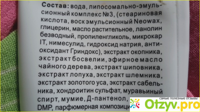 На коробочке и на самой тубе бальзама есть подробный состав этого лечебного снадобья. Состав , действительно, хороший. Здесь мы видим экстракт лопуха. Лопух известен всем, кто страдает болезнями суставов. У себя на даче многие пожилые люди выращивают лопух, чтобы привязывать его к больному месту. Шлемник и золотой ус тоже можно назвать народными лекарственным и растениями. Шиповник и его экстракт особенно тоже прекрасно нам знакомы. Есть здесь и хондропротектор - хондроитин. Также здесь есть экстракты сабельника и босвелии, эфирное масло чайного дерева.