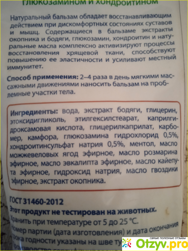 Состав бальзама радует, там много полезностей для наших суставов, в частности масла, хондроитин.