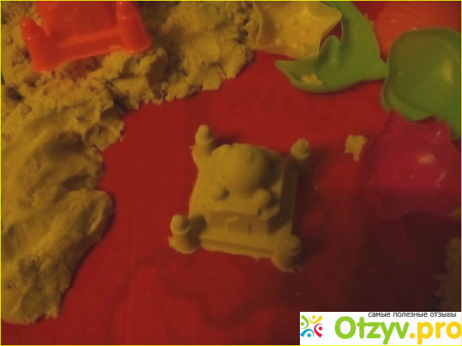 И о чудо! Этот песочек, как его еще называют - кинетический, так запал нам в душу, что вся наша семья теперь увлечена играми в песочнице! Я заказала набор в интернете, в небольшом контейнере был песок желтого цвета три килограмма (к примеру, цветов очень много), набор формочек из шести штук, палочки для лепки, надувная песочница. Набор просто потрясающий.