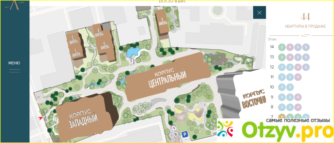Мне понравилось, что все предложения аккуратно представлены на сайте. Есть план, согласно которому и велась постройка, на котором видно как располагаются корпуса и виллы.